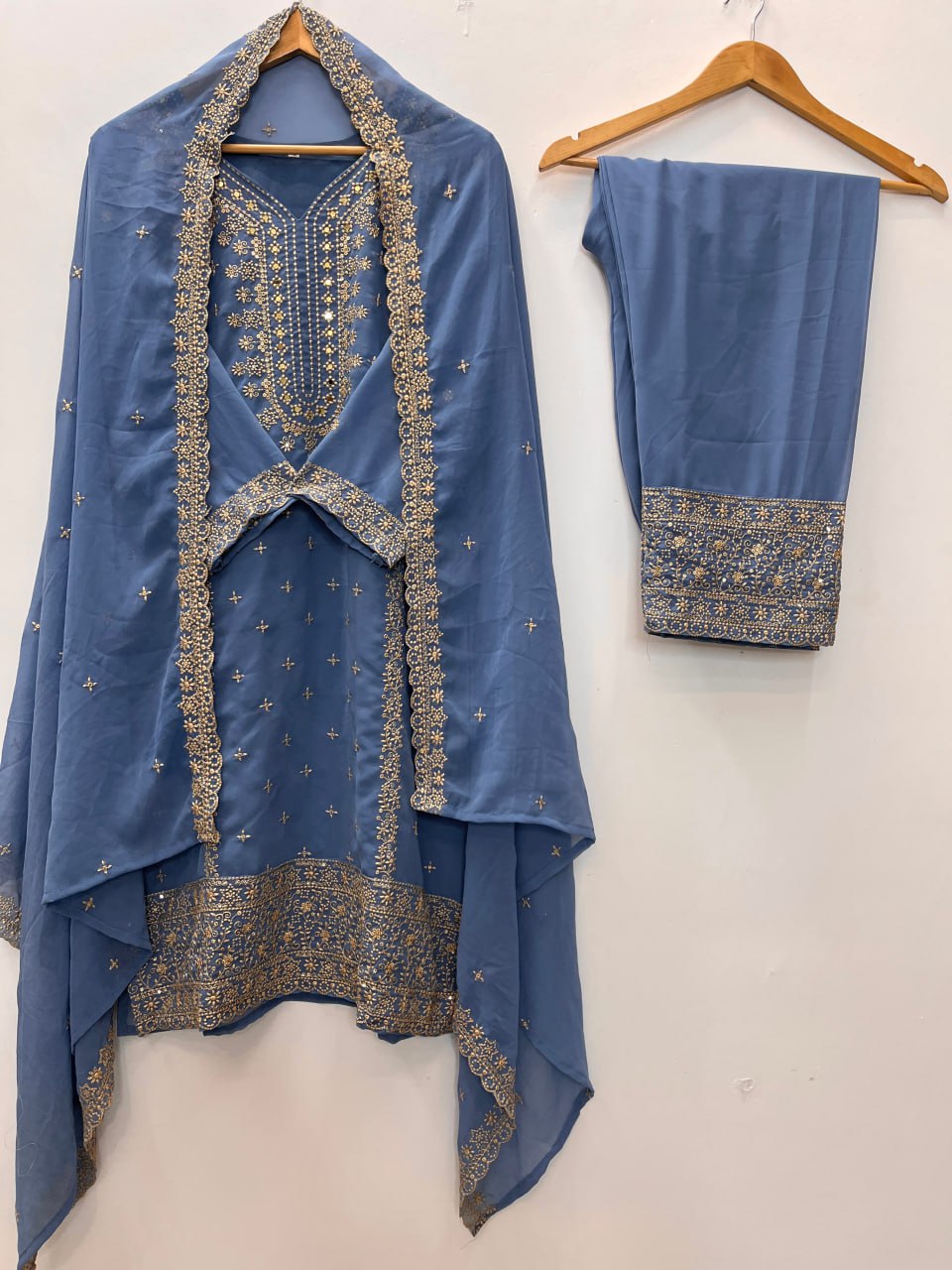 Grey Blue Heavy Faux Georgette Suit Set with Sequence Embroidery Work