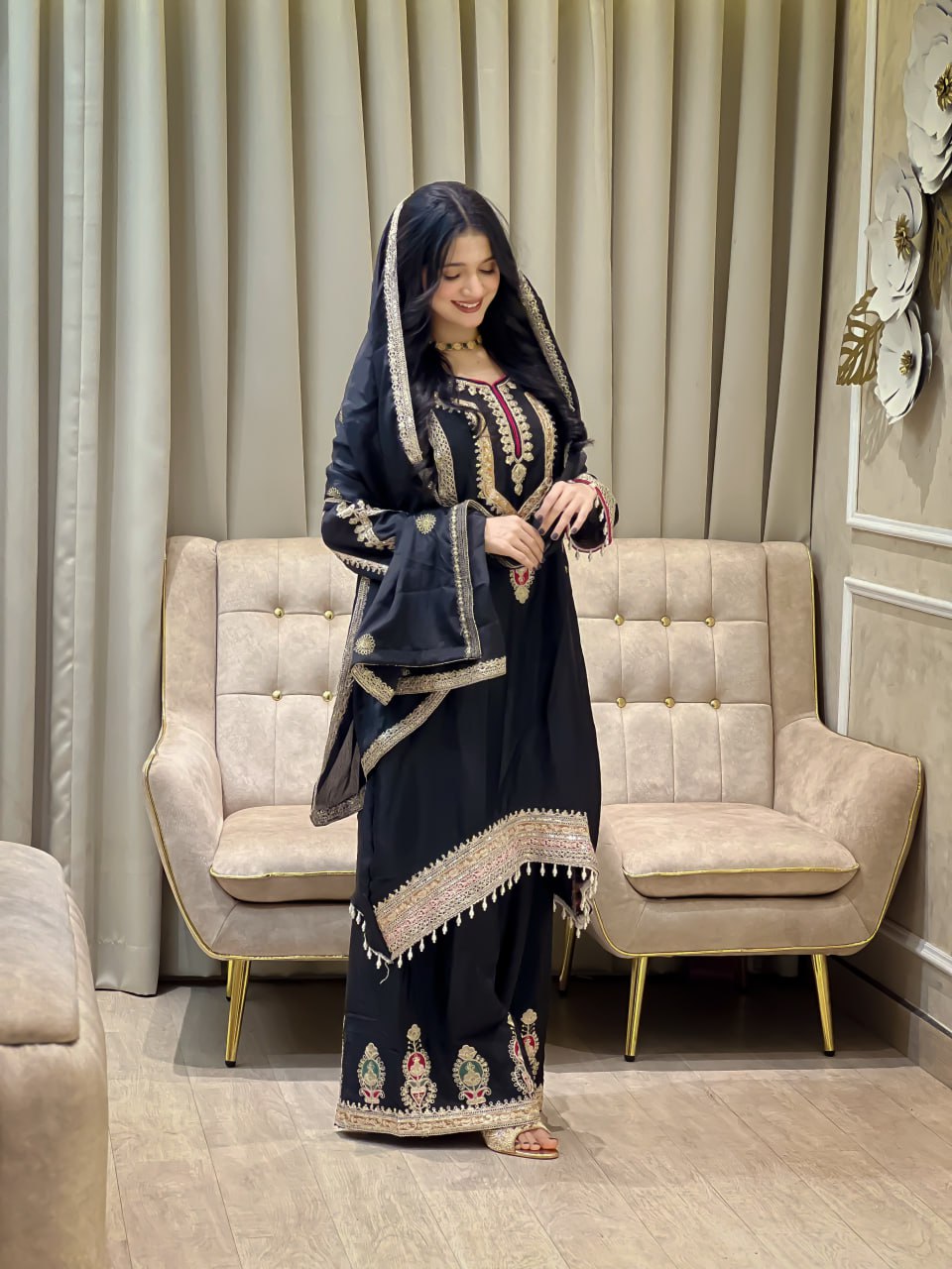 Midnight Noir Heavily Embroidered Kurta Set with Chinon Silk Dupatta